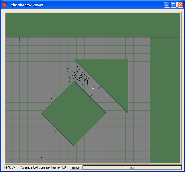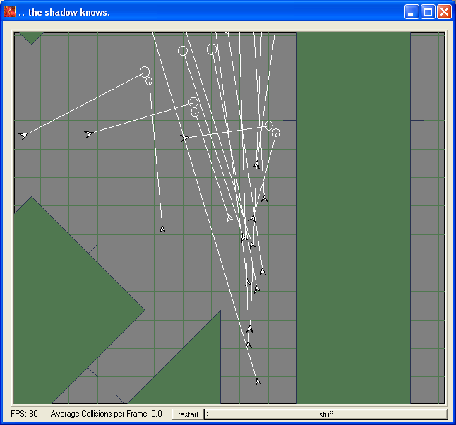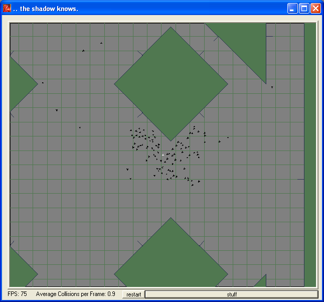 FlockI took a pass at flocking. Unfortunately, i've lost the source-code to this app. Jeeze! But the download is still fun to play with. The essence of flocking turned out to be collision prediction. With the simple rule of just avoiding Predicted Collisions, birds tend to align in self-organizing flocks! Other rules were added for Hunting, and dealing with walls has some problems, but basically it was fairly simple. Here's the download and a few screenshots.